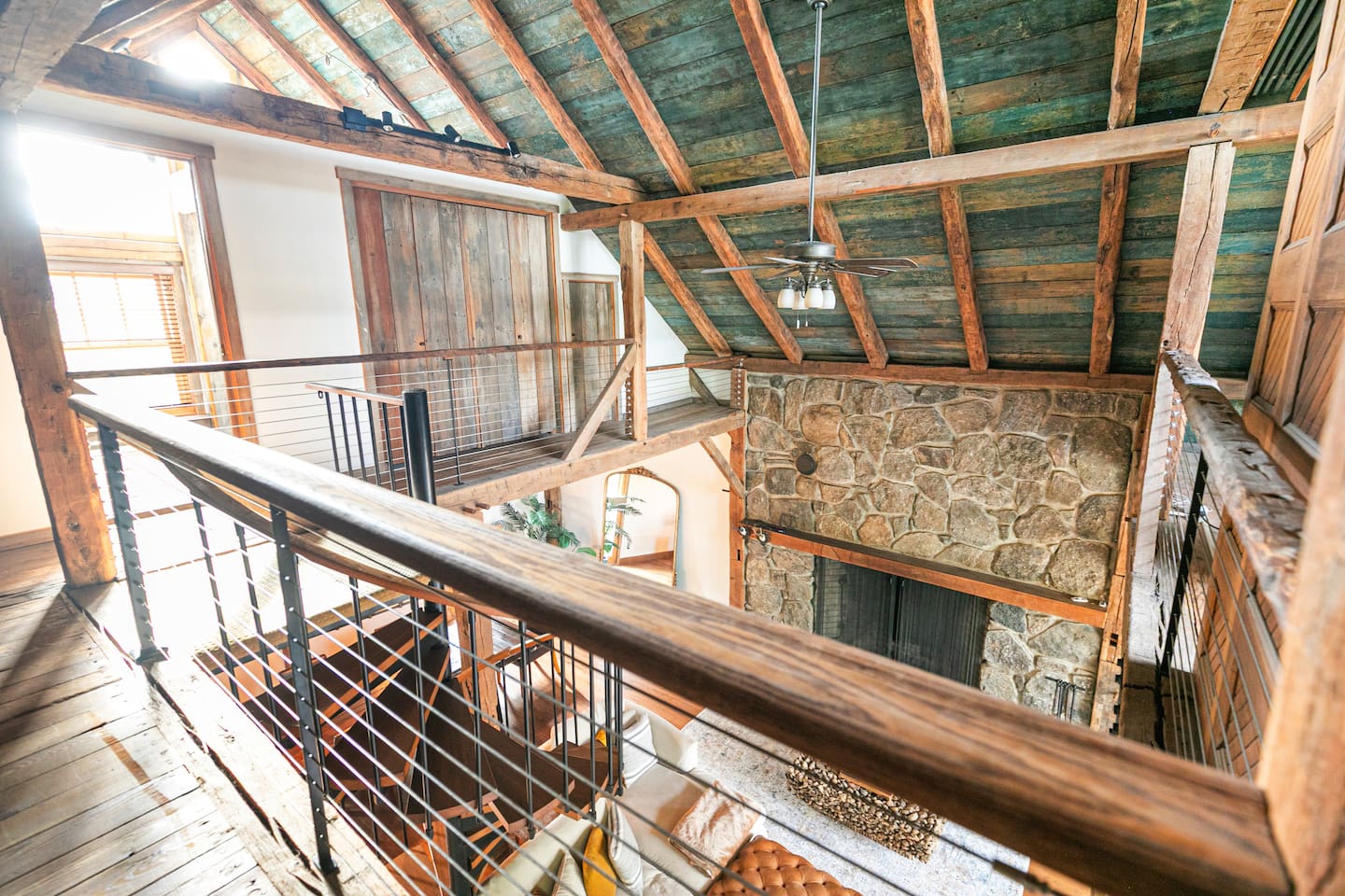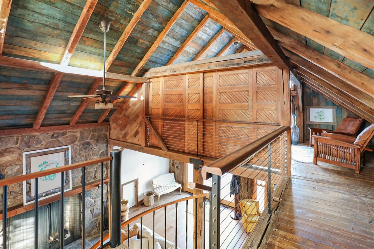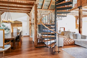 Walk in through double doors overlooking the pool and you’re greeted by a soaring barn interior with a dramatic spiral staircase and:
