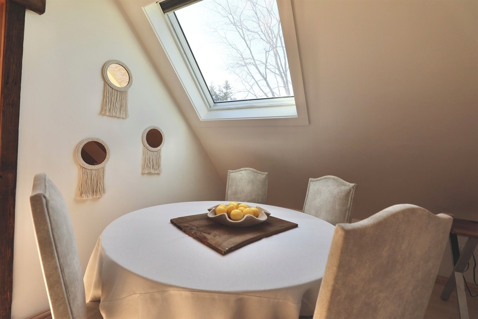Inside the main house, large dinning area with a fireplace, multiple couches, sitting areas, TV, games and dinning table,