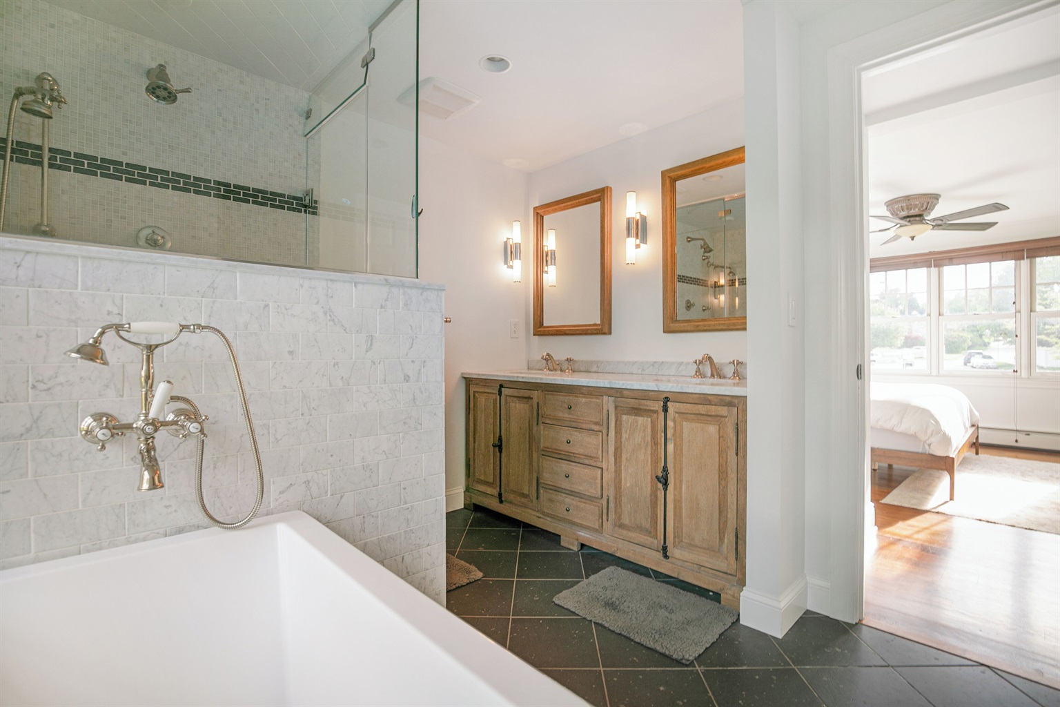 Sunlit luxury bathroom: double sinks, large soaking tub, and steam shower